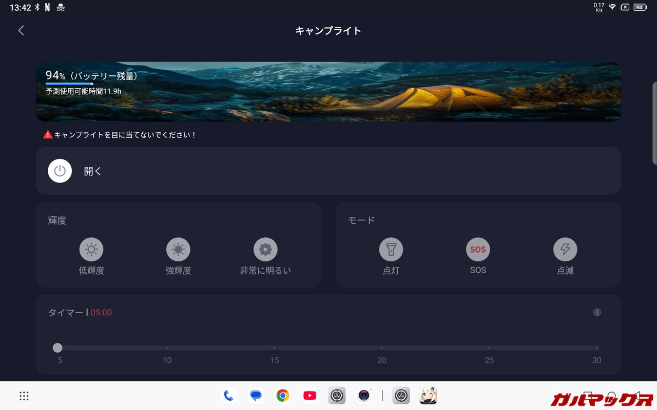 ▼キャンプライトの画面では使用可能時間の確認、明るさ調整、点灯モードの変更、タイマーなどの設定が出来るようになってました。↓