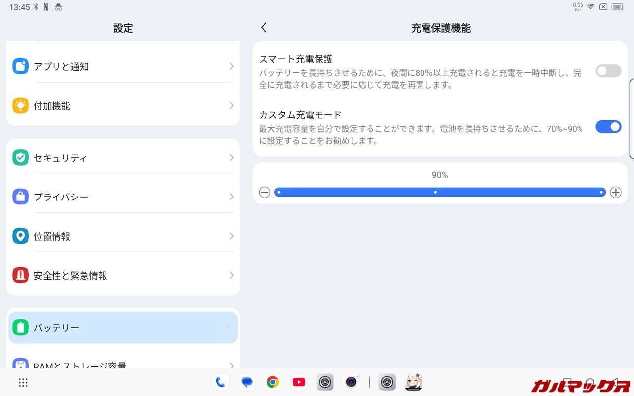 ▼そうそう、本機はバッテリーの充電制限機能も搭載していました。70/80/90%で充電を止められます。満充電を避けることで電池の劣化を防いでくれるので嬉しい機能ですねぇ。↓
