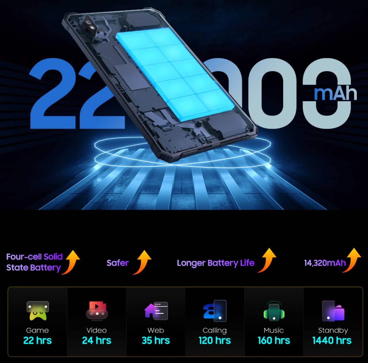 ▼バッテリー容量は脅威の22,000mAh!スマホ4台分もの巨大っぷりです。丸一日動画を見られるレベルの電池持ちの良さ。ヤバすぎるぞこれ。↓