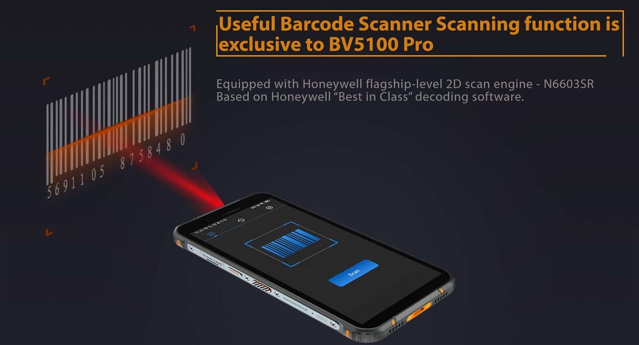 Blackview BV5100 Proの上部にはHoneywellのバーコードリーダーが搭載されており、カメラを介さなくても直接バーコードスキャンに対応しているのが特徴となります!