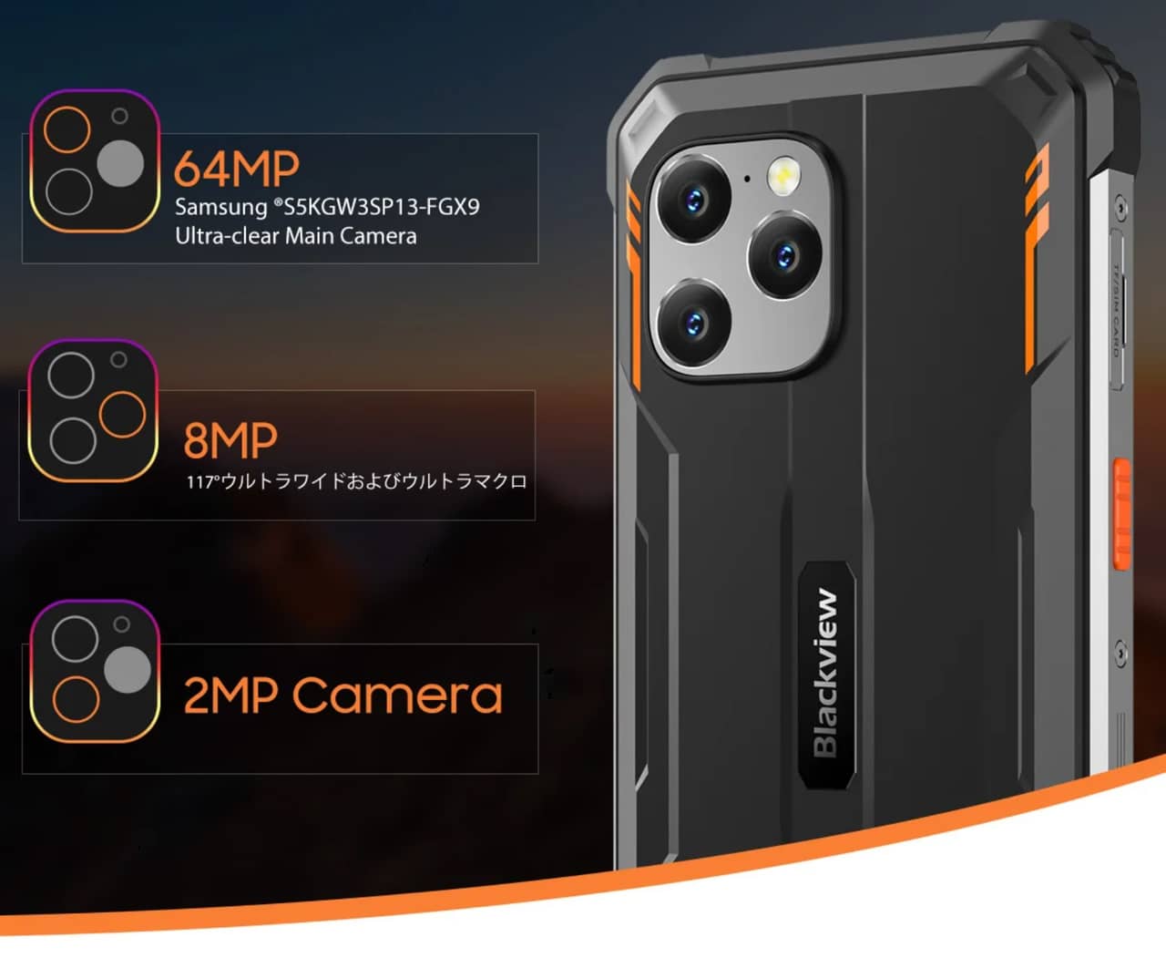 Blackview BV8900 Proのカメラはメインカメラが6,400万画素と高め。サブカメラは800万画素の超広角カメラを採用しています。もう1つの200万画素は詳細不明。大体は深度測定用など補助カメラなんですが、気になる方はレビューが出たらチェックしましょう。