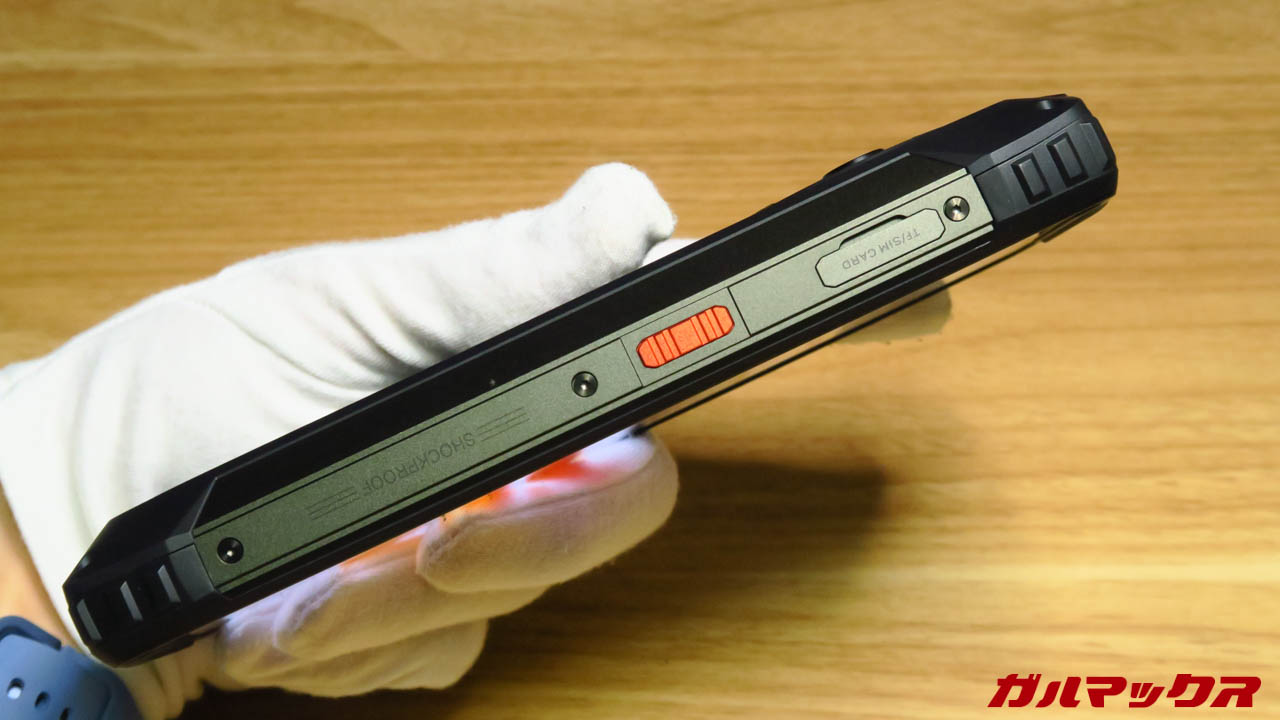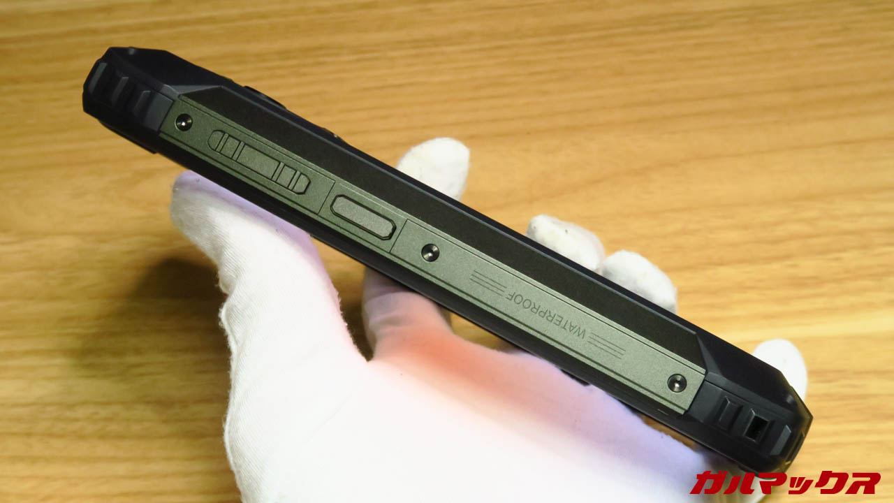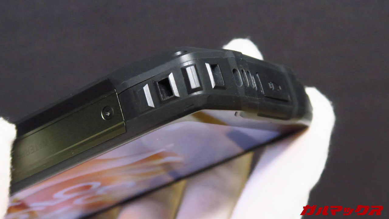 ▼特に厚みがものすごくあって普通のスマホを3台重ねたような肉厚ボディ。とはいえこういう鈍重さというか手に余るような超重量こそがタフネスの醍醐味とも思えます。個人的にはデカさも重さも厚みもネックとは思いません。側面はこんな感じ。↓