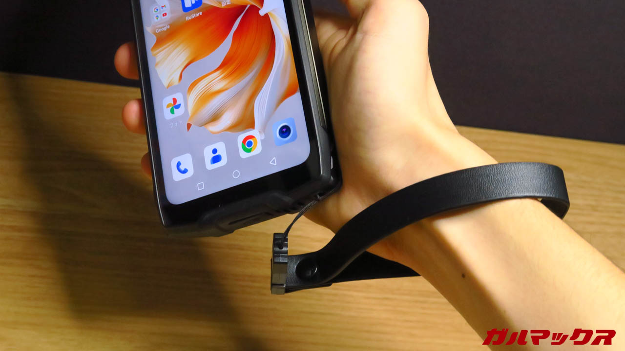 ▼タフネススマホ特有のストラップ穴も搭載。付属品にストラップも付いておりこういう感じで通して使えます。付属品のやつは短めで手首やリュック・ベルト等のカラビナ用っすね。↓