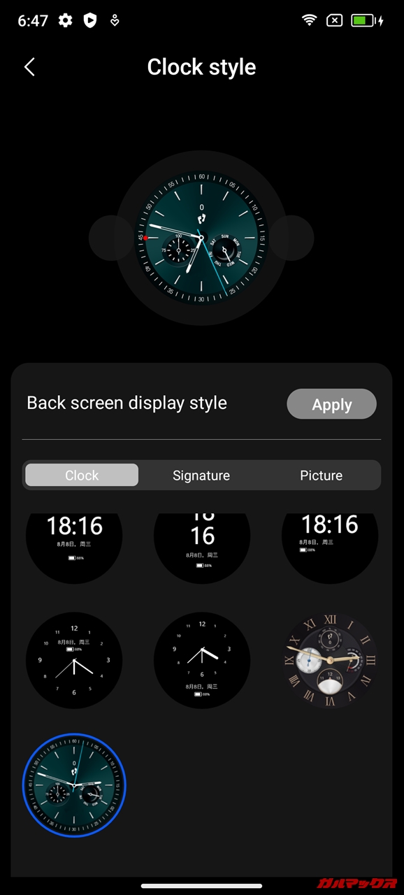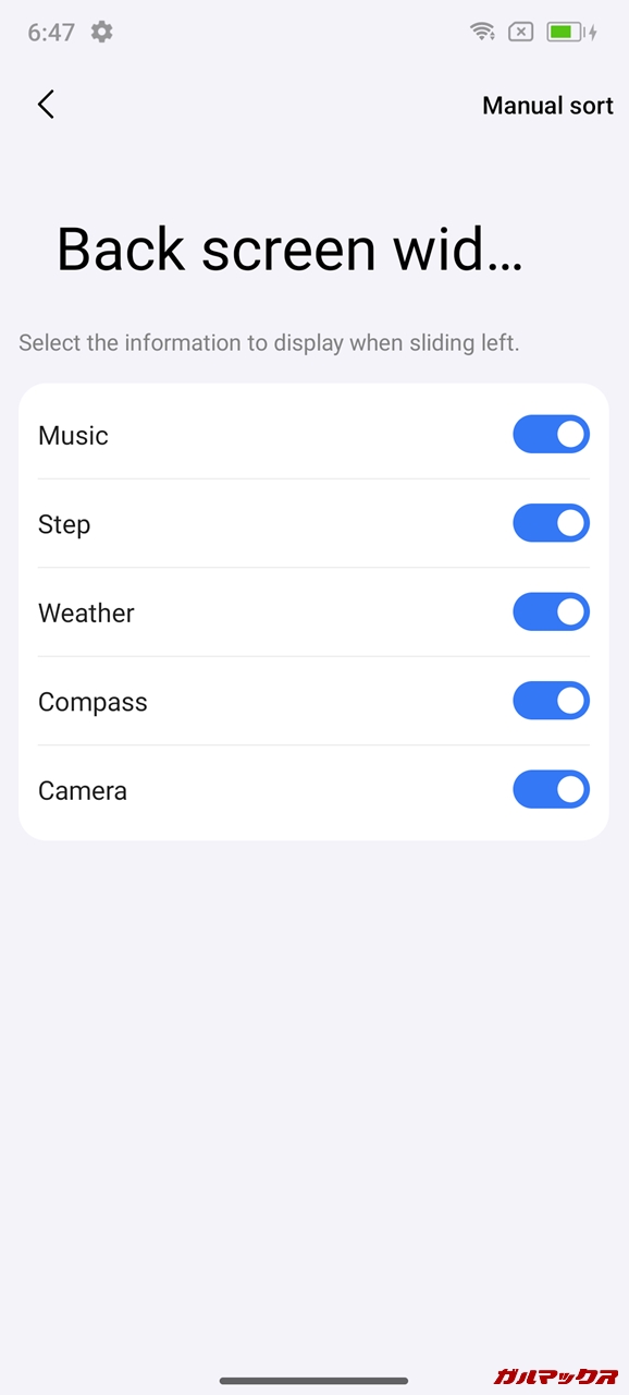 ▼設定のBackScreenって項目から文字盤や時計のスタイル。またウィジェット(天気予報や音楽コントロールなど)の表示、非表示設定もできます。スマートウォッチみたいな感じ。↓
