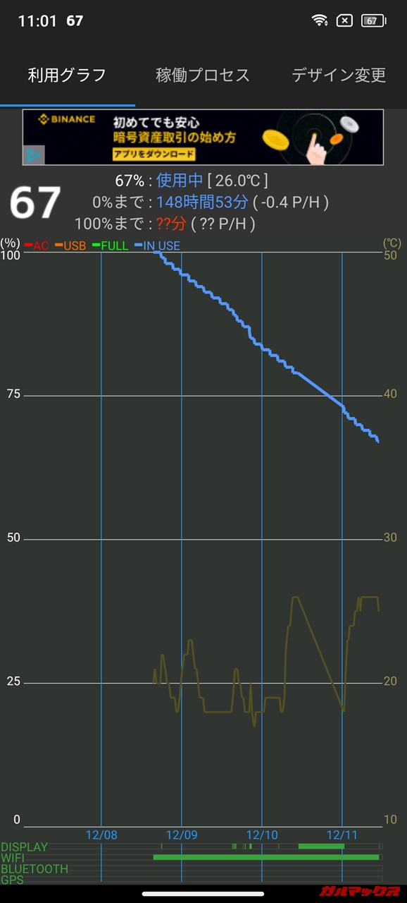 ▼ただ、ディスプレイ消灯で使っていなくても定期的に電池がちょぼちょぼ減ってしまいます。背面ディスプレイがずっとバックライト点灯しているせいなのかな。↓