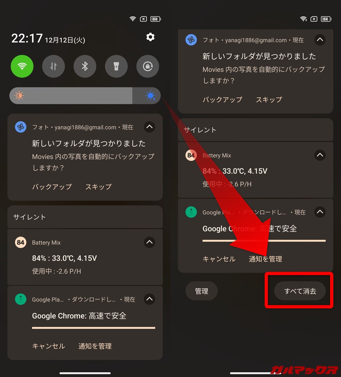 ▼通知のすべて消去ボタンも下にスクロールしないと出てこないタイプでした。地味に不便で困る。↓