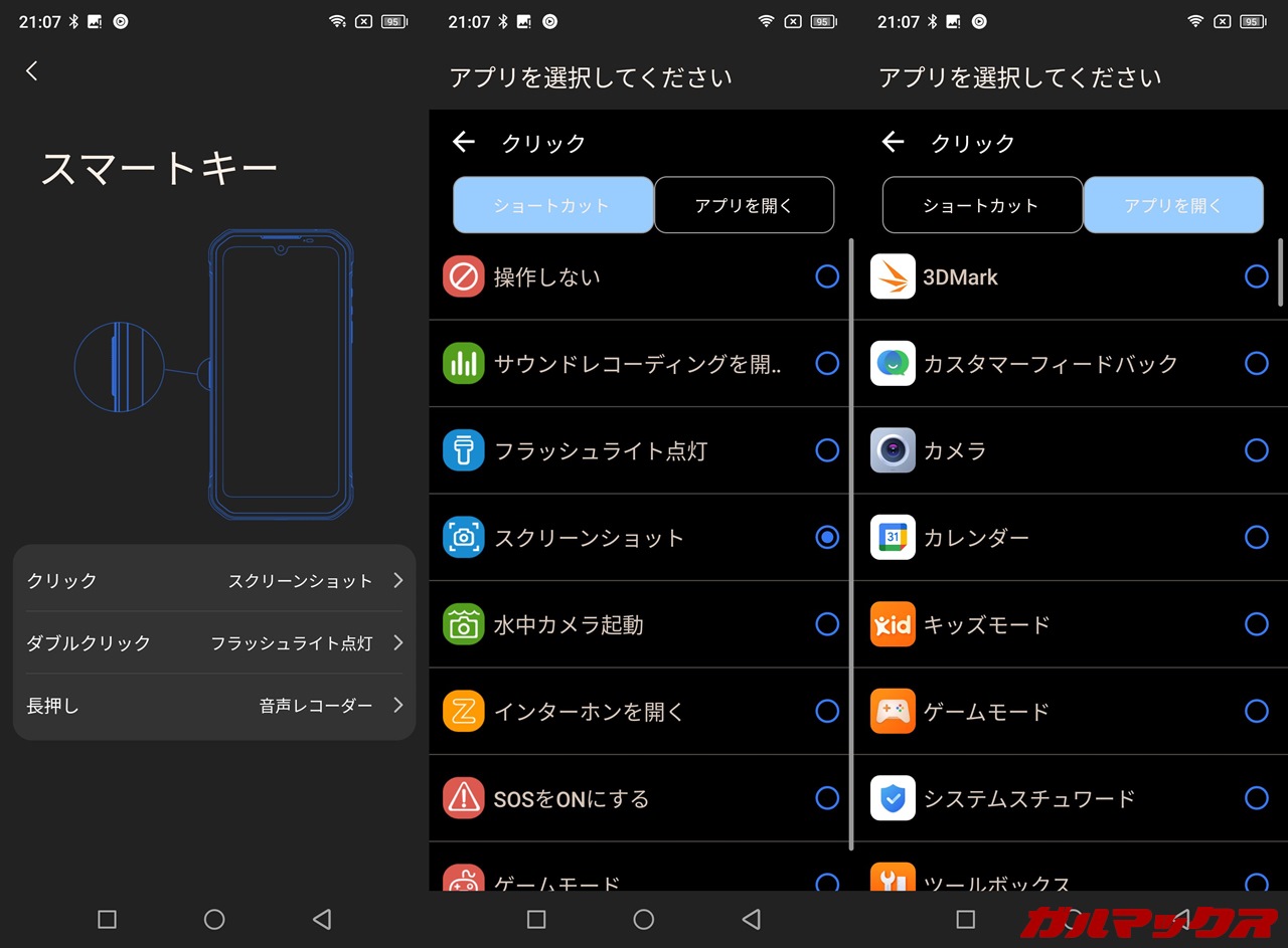 ▼「1回押し」「2連続押し」「長押し」の3パターンでそれぞれ挙動をカスタマイズ可能。ショートカット操作を3つまで割り当てられてこれはかなり気に入ってます。↓