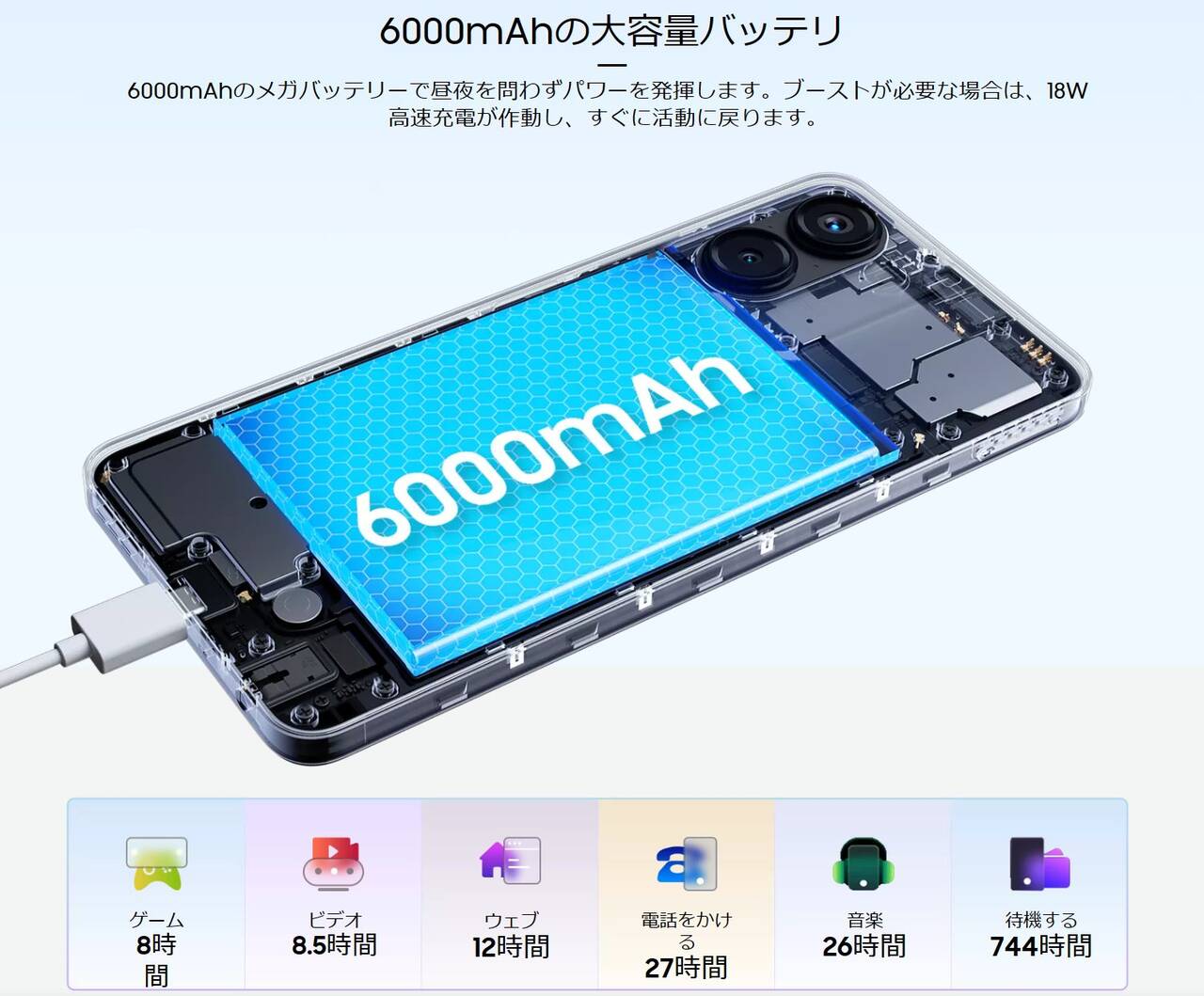 バッテリー容量はこの手の通常スマホとしては破格で6000mAhとなっていますよ!ハイエンドを含んだ非タフネススマホはたいてい5000mAh~5500mAhが頭打ちだっただけにここはかなり特化しているという印象。