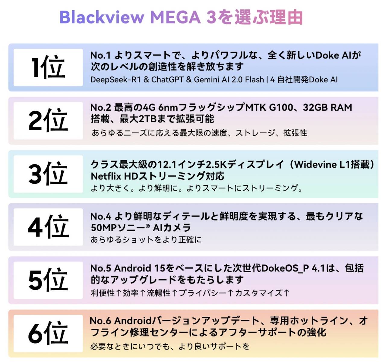 ▼ちなみにメーカーは「Blackview MEGA 3を選ぶ理由」として1位にAI機能をピックアップしてます。いや〜、さすがに1番のウリ機能は試用期間中に試してみたかった…。↓