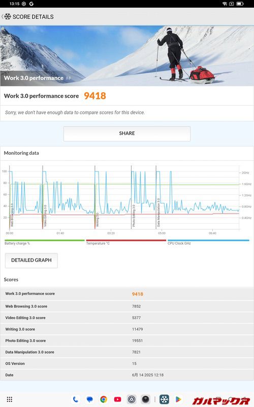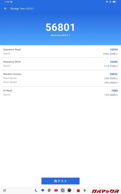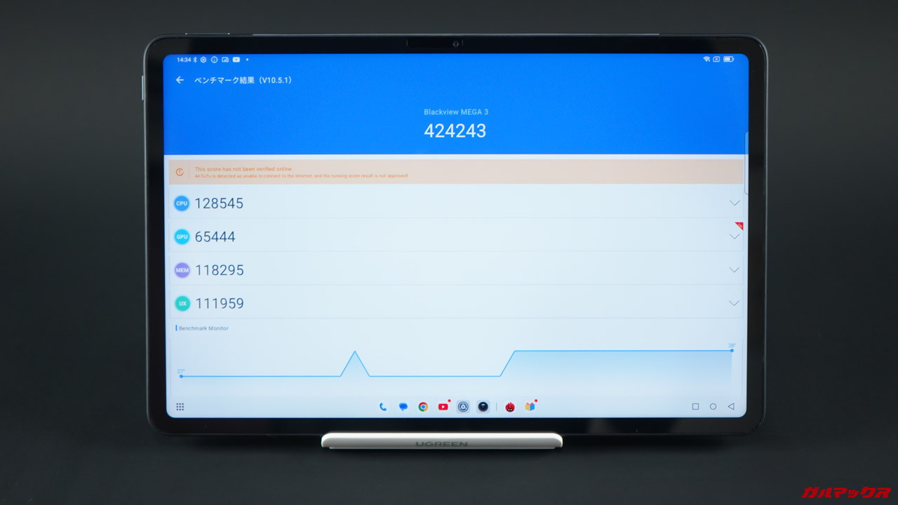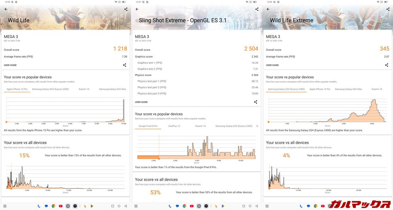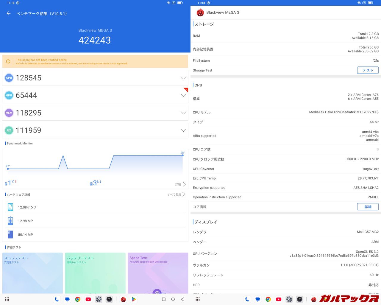 ベンチマークの項目でスクショを掲載しているんですけど、AnTuTuは総合スコアが約42万点、GPUスコアが約6.5万点なので、執筆時点でガルマックス基準だとエントリー水準と言ったところです。