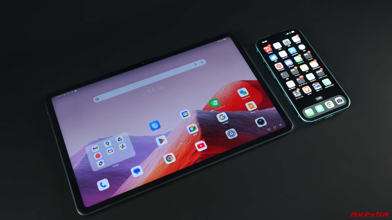 Blackview MEGA 3は12.1インチの大画面モデル。上の写真はiPhone 16と並べてます。デッカイ…!