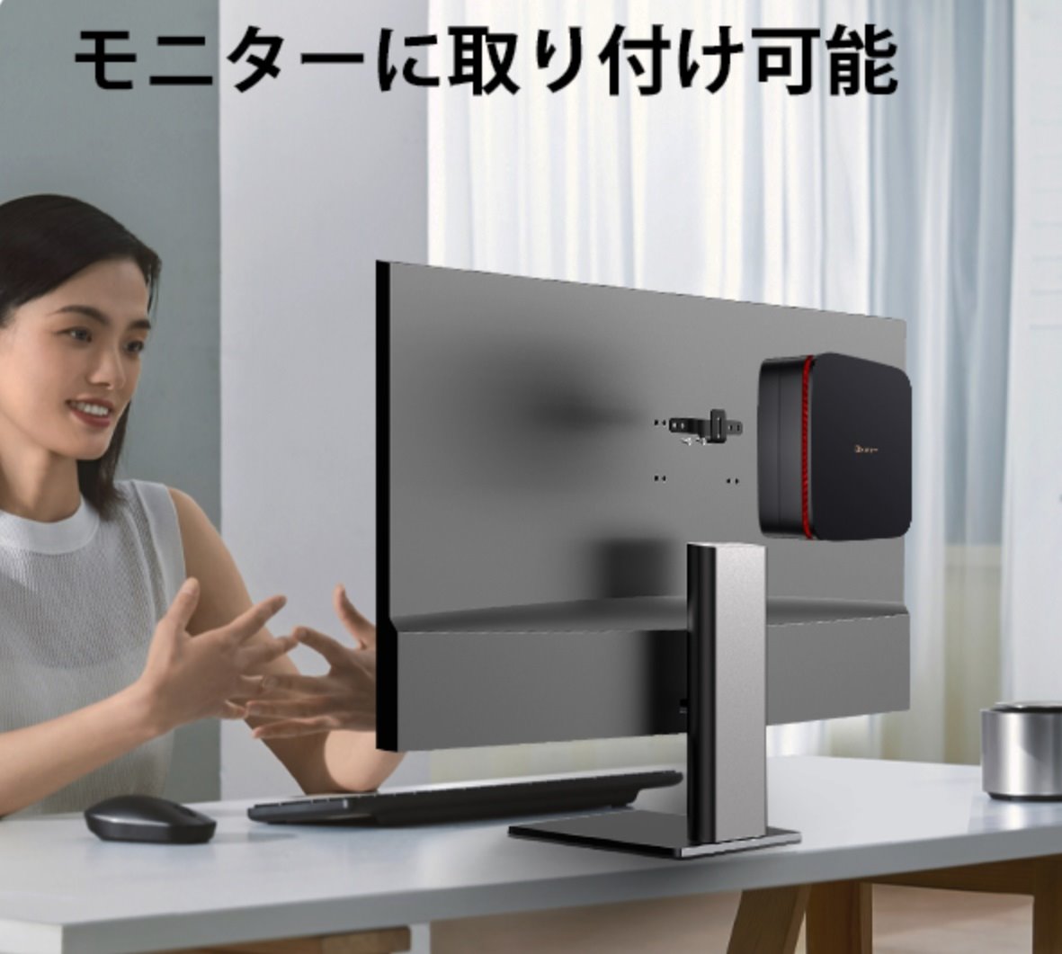▼しかもVESA規格対応!つまりモニター裏に取り付けられることもできちゃいます。超省スペースゆえ机の上スッキリキレイに使えるのも魅力。↓