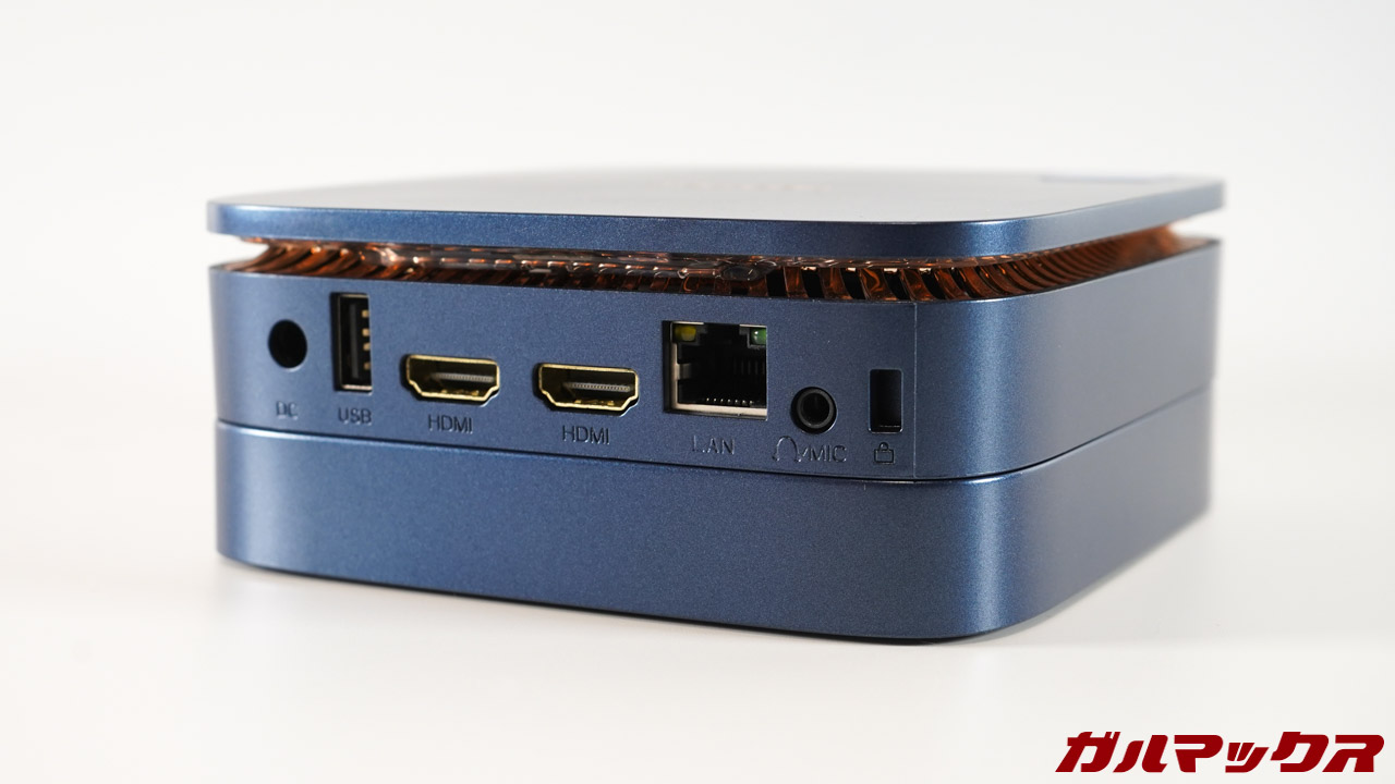 ▼裏面に電源、USB 2.0、HDMI×2、LAN端子、イヤホンジャックと揃っておりライトユースではそうそう困らないでしょう。特にHDMI端子が2つあることで、デュアルモニター出力ができるってのも魅力!↓