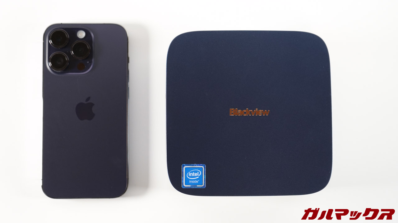 ミニPCって言われるように、スンゲーちっちゃいです。左がiPhone 14 Proで右がBlackview MP60。並べるとその小ささがよ~くわかる。↓