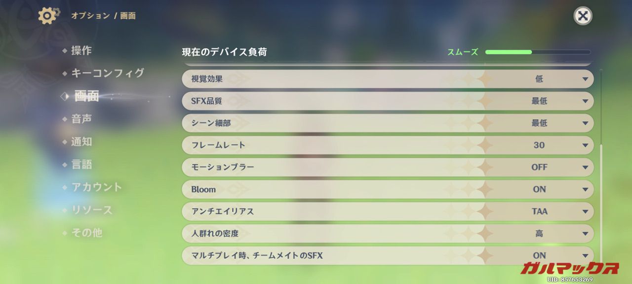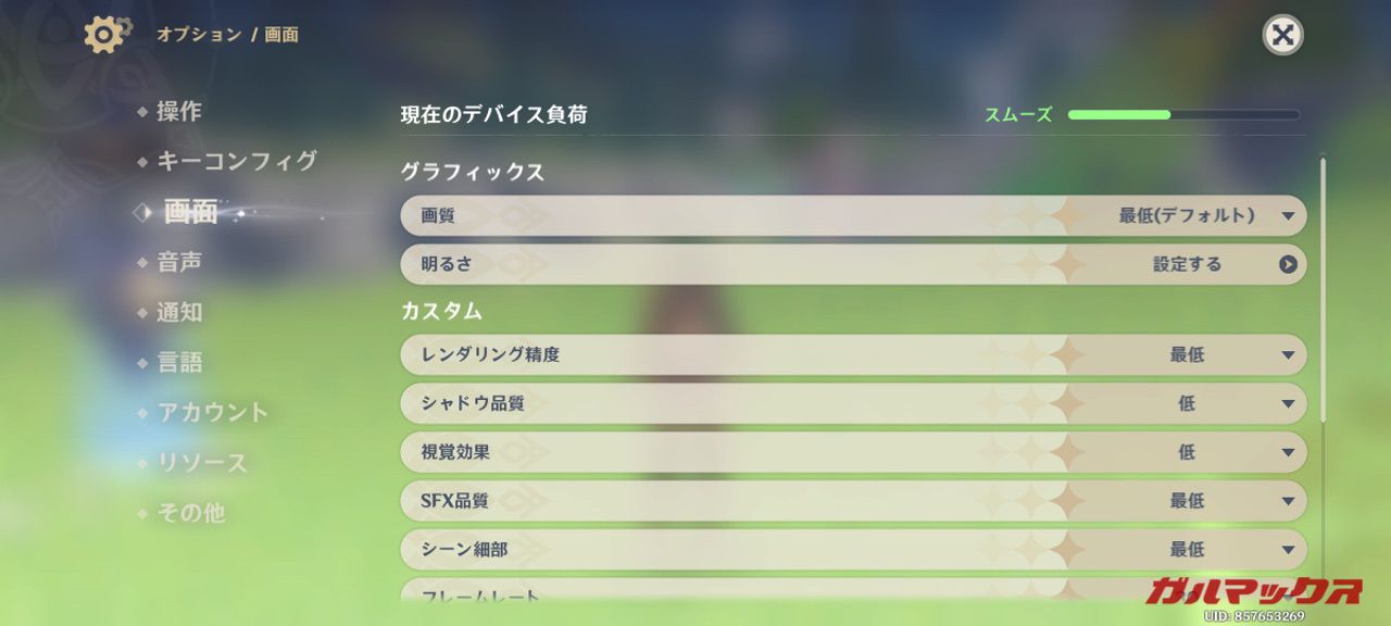 ▼とは言いつつ、いつもの原神テストはやります。デフォルト設定は「最低」。この設定のフレームレートを60にして検証します。↓