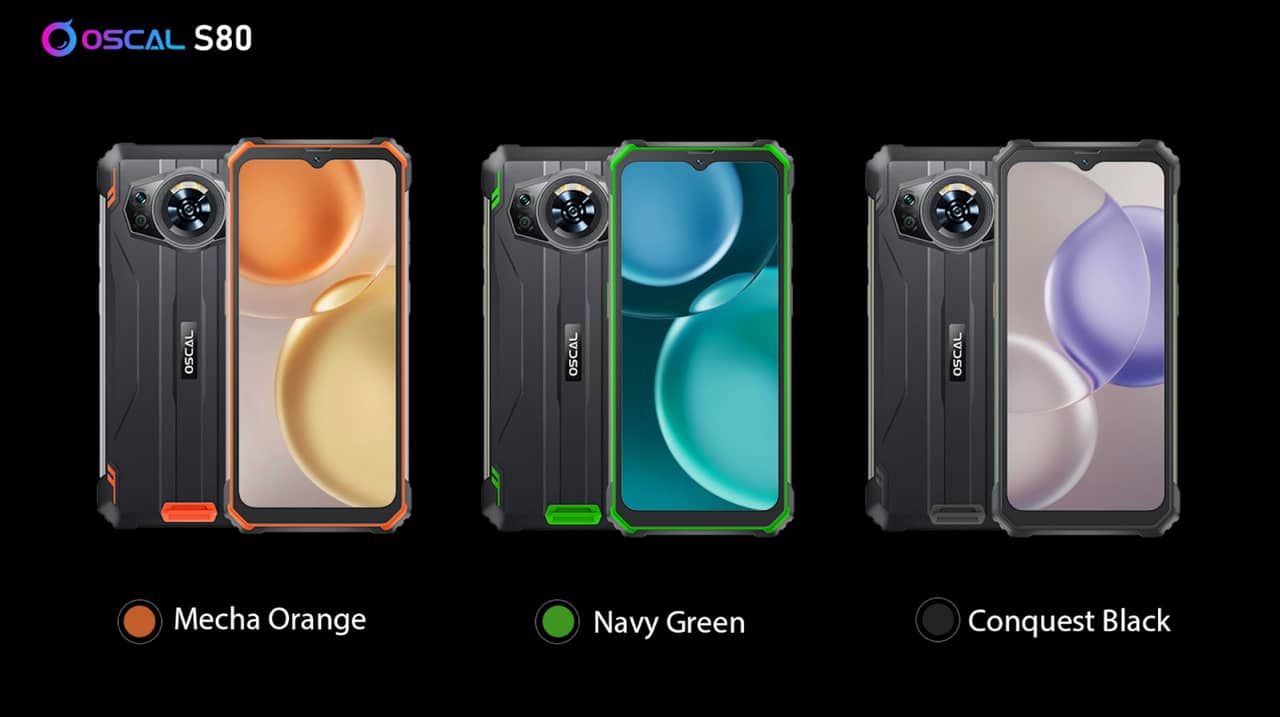 ▼OSCAL S80のデザインはタフネススマホらしいゴツゴツした造形で、特に中央に配置されたカメラのデザインが印象的です。カラーはオレンジ、グリーン、ブラックの3色。↓