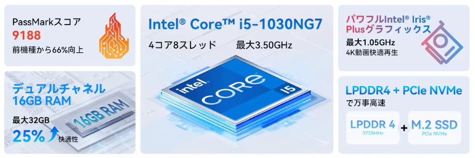 ▼CPUは第10世代のCore i5-1030NG7。PassMark公称値は9,188点を謳います。動画編集はちょっと荷がおもそうですが、日常使いでは快適レベルで動く水準です。↓
