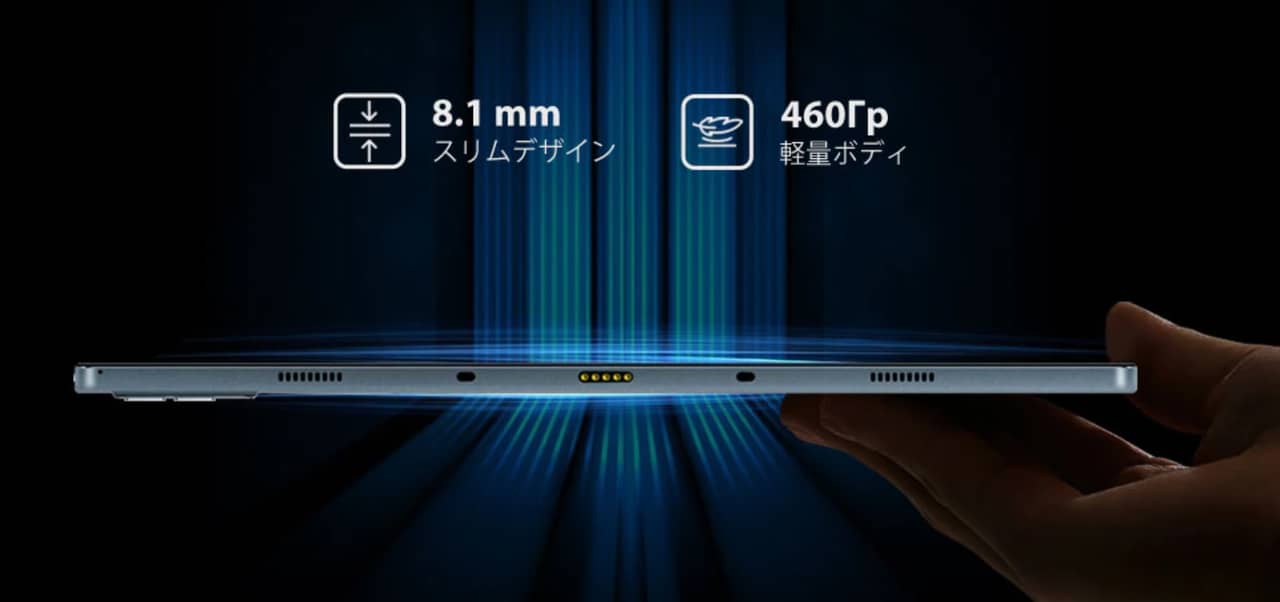 ▼筐体サイズは高さ、横幅ともに非公表ですが10.4インチタブレットながら重量は480gと比較的軽量になっています。8.1mmの厚さはまぁ標準的かな。↓