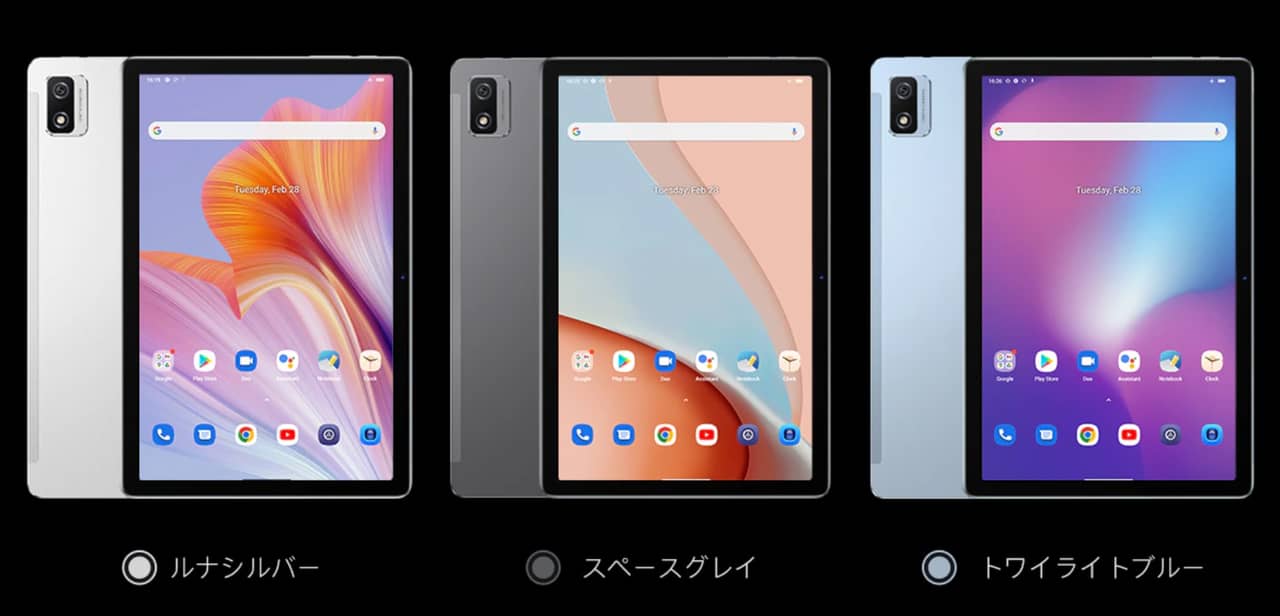 ▼Blackview Tab 12 Proはフラット調のデザインを採用しており安いタブレットとはいえ結構スタイリッシュな印象を受けますね。最近のBlackviewタブレットって結構こういうかっこよさを重視しているっぽい。カラーは3色です!↓