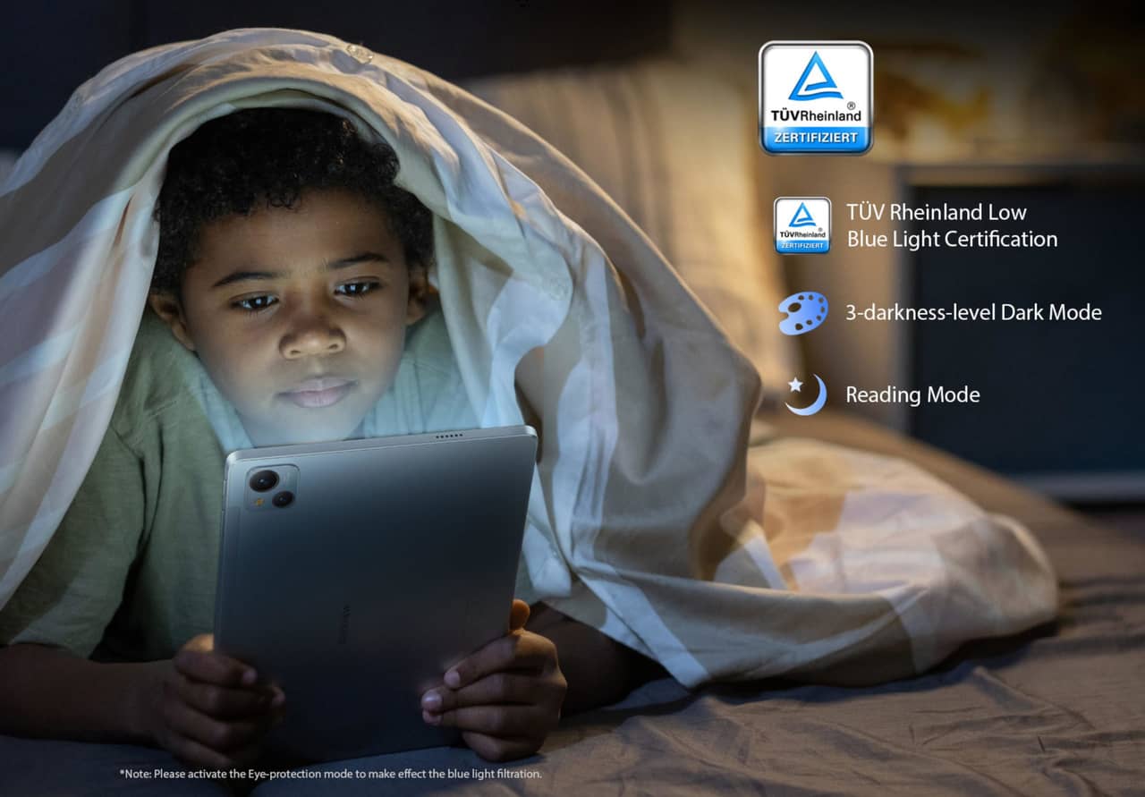 ▼またテュフラインランド認証を獲得しており、3段階のダークモードと読書モードで目に優しいディスプレイを搭載!電子書籍用途にも良さそう!画像のように暗い場所で見たり夜更かししたりは身体に良くないんでほどほどに。↓