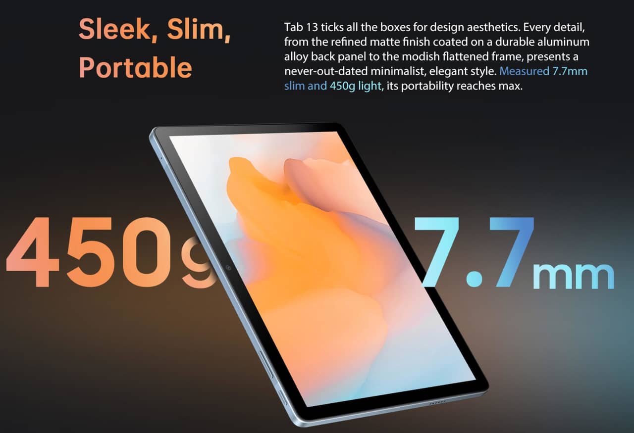 ▼Blackview Tab 13は高級タイプの筐体デザインで、側面がフラットになっているのが特徴!ミドルレンジタイプのタブレットですが結構カッコいい。重さは450g、厚みは7.7mmで、比較的軽量かつ薄型なのもポイントです。↓