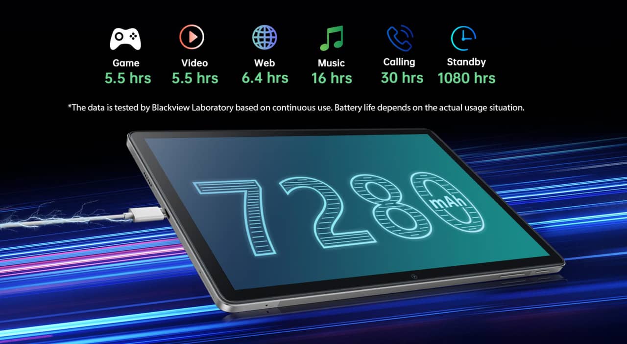 ▼バッテリー容量は7,280mAhでこのサイズのタブレットとしては十分。動画視聴においては連続5.5時間まで電池が持つそうです!ただし急速充電に対応しているかは記載なし。↓