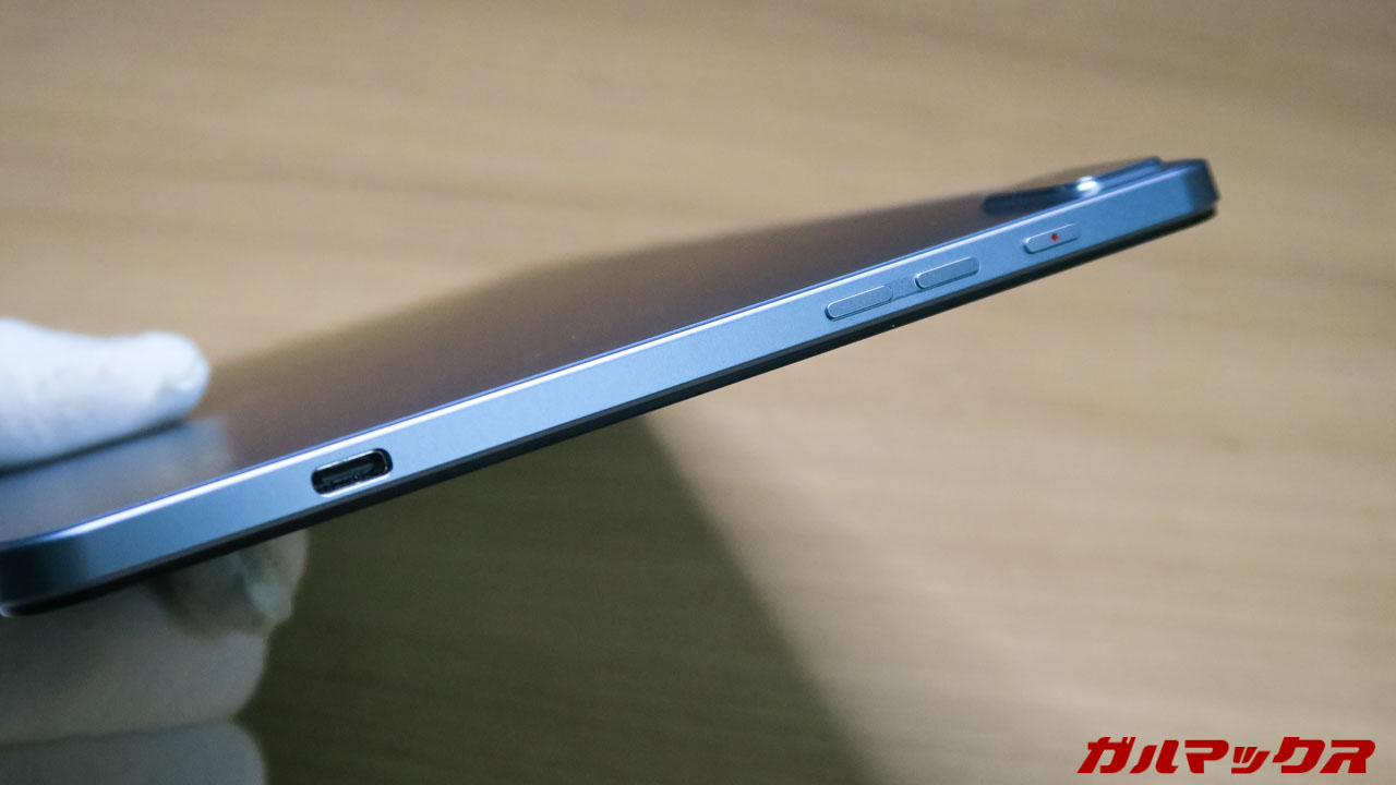 ▼重さは531gでした。側面がフラットになっているため持ち心地はソリッドな印象。ただデカいタブレットだから、小さいスマホと違って手に刺さる持ち心地は感じにくく悪くはないです。↓
