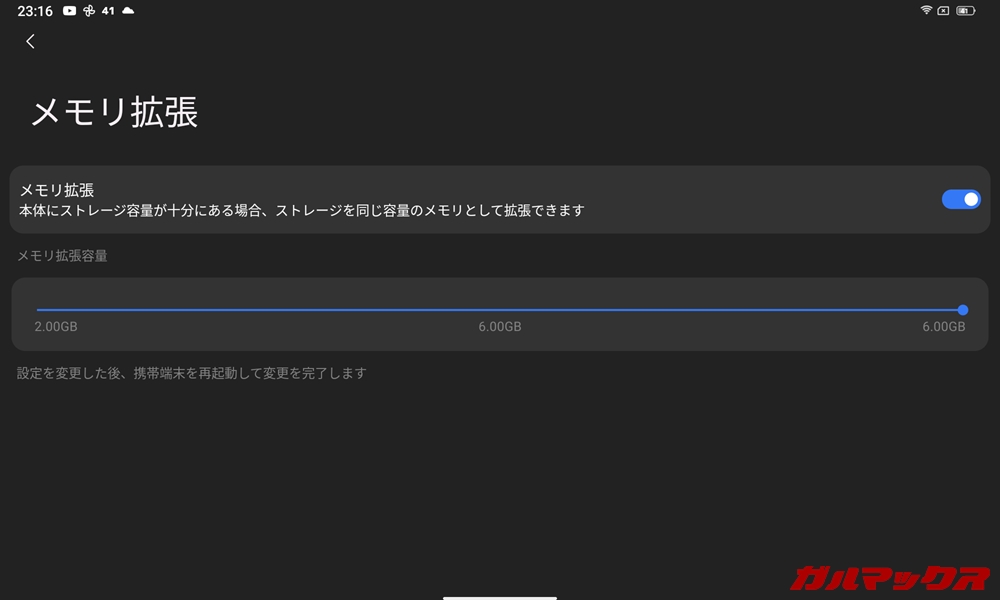 ▼あとメモリ(RAM)が8GBと大容量。加えて最近流行りのRAMブーストも完備しており最大で6GBまでぶっ込めました。スライドする事で0.01GB単位で調節可能。中央に現在選択している拡張容量が表示されます↓