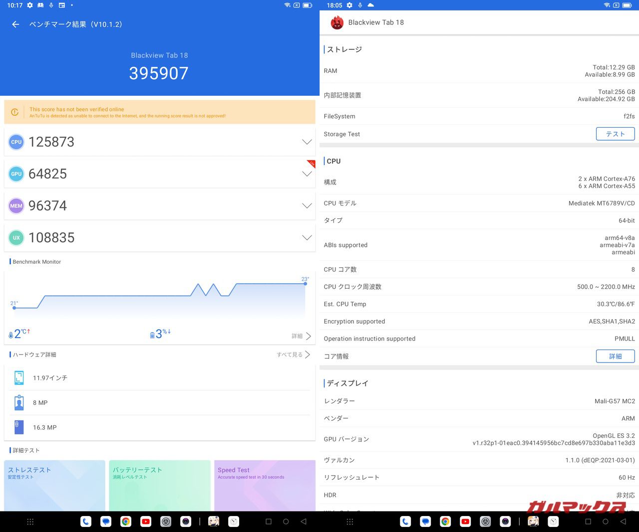 Blackview Tab 18/メモリ12GB(Helio G99)の実機AnTuTuベンチマークスコア