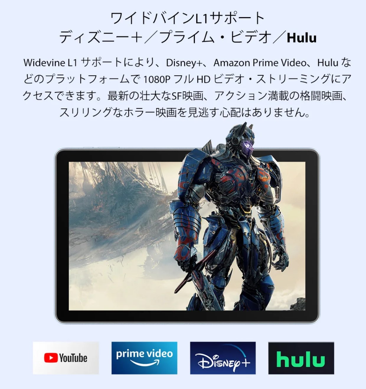 安価ながらWidevine L1は対応しているので、プライムビデオやHuluなどの著作権コンテンツのHD再生ができるってのは魅力!安いタブレットで映画とか楽しみたい方にアリかも。