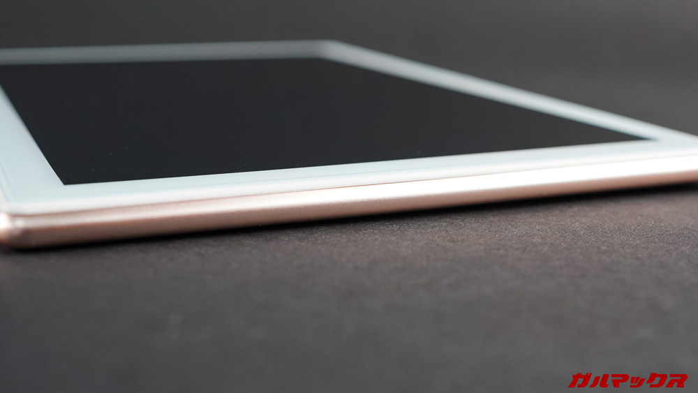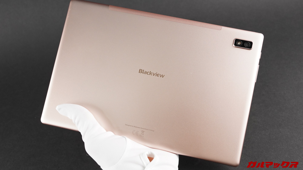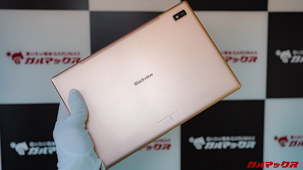 ▼Blackview Tab 9の背面はサラサラな手触りのマットな質感!カラーはゴールドで、かなり高級感を感じられる印象を受けます。すごくスベスベな感じが好き。↓