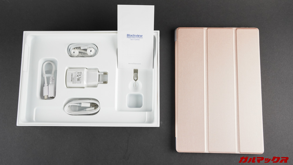 ▼Blackview Tab 9を開封して「おっ!」ってなったポイント。なんと手帳型のケースが最初っから付属していたのです!クリアケースを付属するスマホは見てきたけど、タブレットで手帳型のものを付属するのは驚きですた。↓