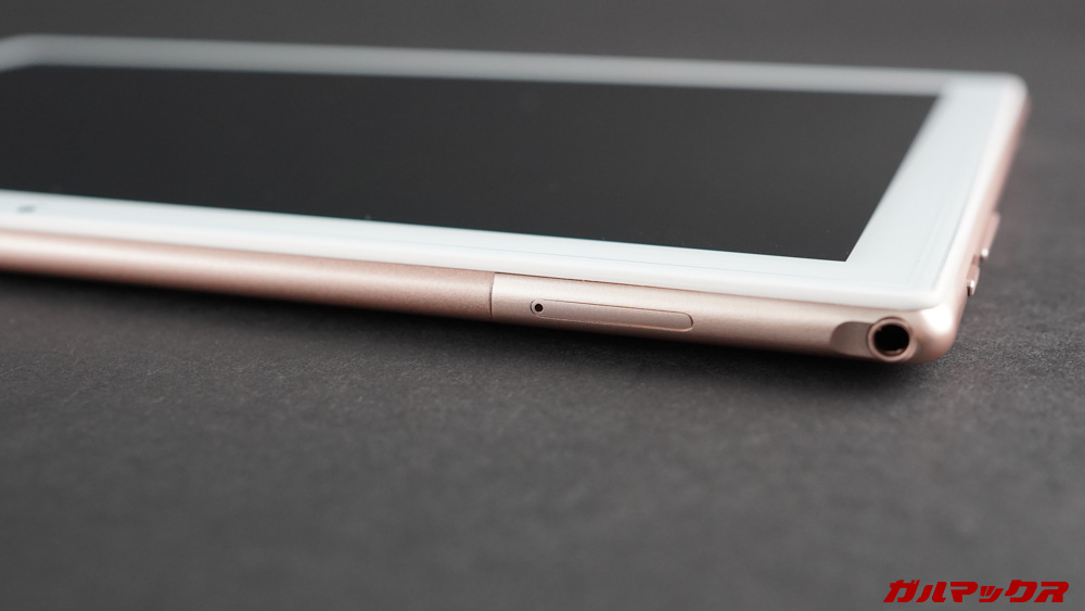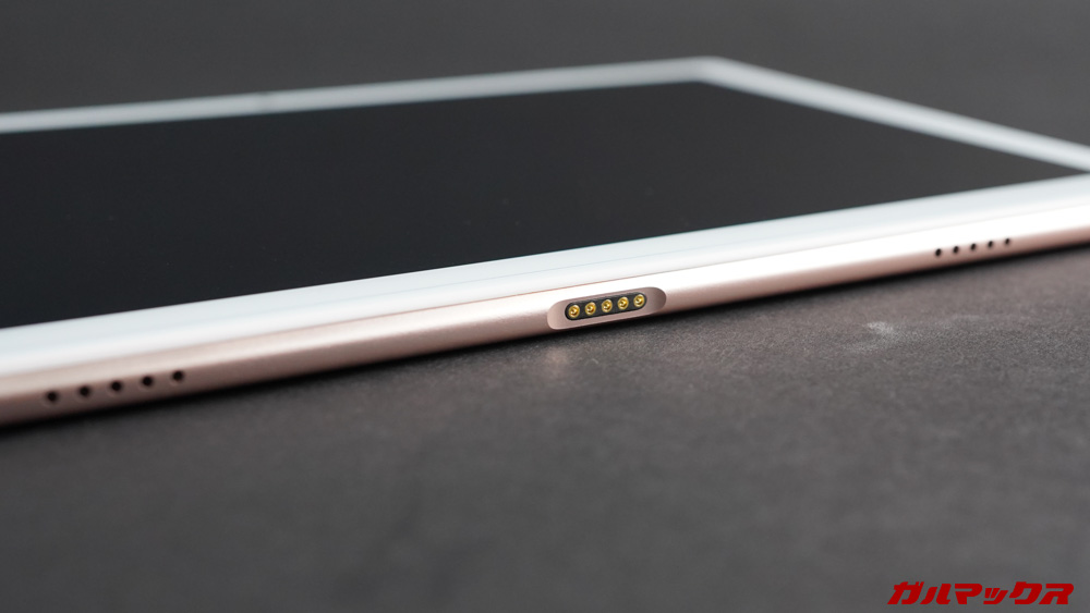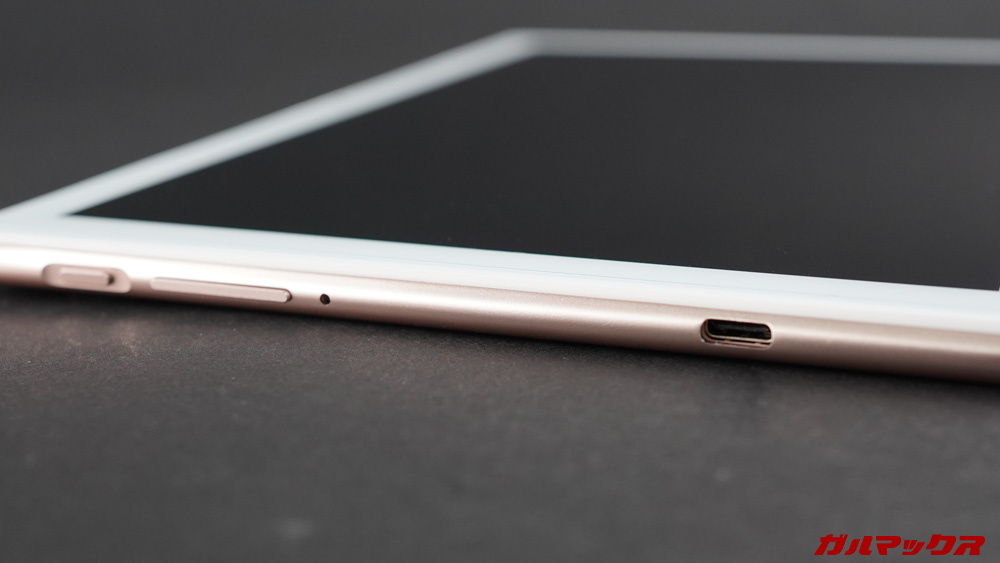 ▼インカメラを上にして横向きにした際は、画面から見て左側にボタンとポート類が配置。イヤホンジャックのみ上部左側に配置となっており、全体的に左寄せとなっています!下部には充電・別売りキーボード用のドックも備わっています!↓