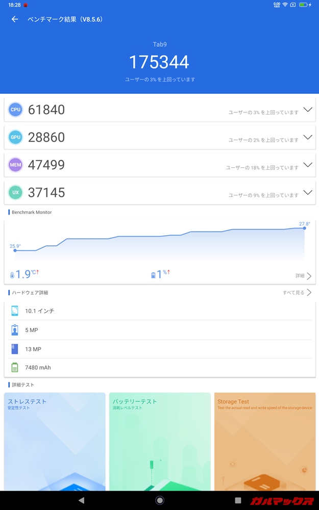 ▼Blackview Tab 9の実機でAnTuTu(Ver8)を測定しました!総合スコアは175,344点、GPUスコアは28,860点です!タブレットにして十分良いスペック!↓