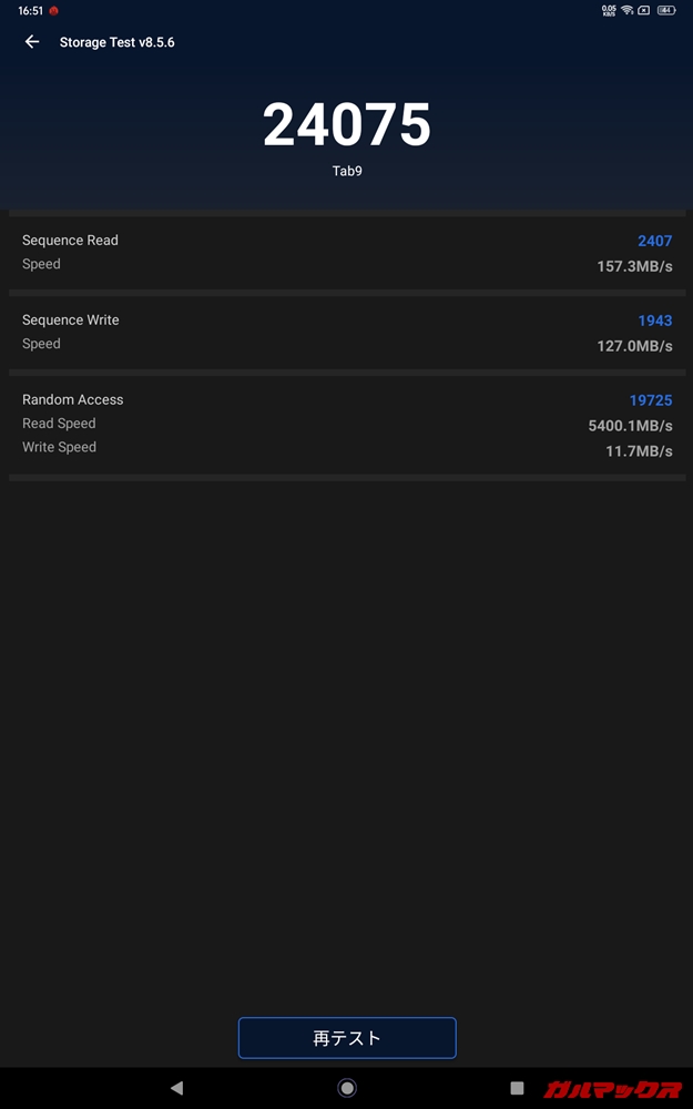 ▼ストレージ速度は読み込みが157.3MB/s、書き込みが127MB/s。↓