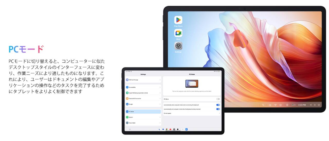 ▼OSは便利機能満載のDoke OS(Android 14ベース)を採用。パソコン風に使えるPCモードに対応しているのはBlackviewタブレットの特徴。↓