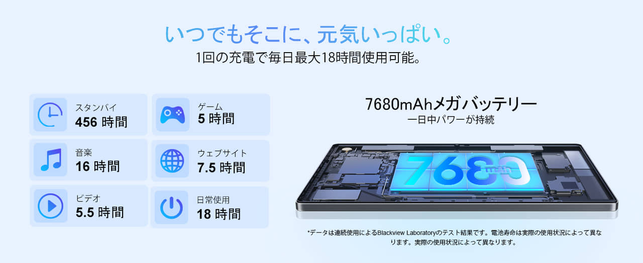 ▼バッテリー容量は7,630mAhと順当な大きさを搭載。電池持ちは動画再生で5.5時間。使わなければバッテリーは持つけど、動画やゲーム、WEBなど使い込めばガリガリ消費されていくタイプ。とはいえWi-Fiモデルで持ち出す頻度が少ないことを考えれば十分でしょう。↓