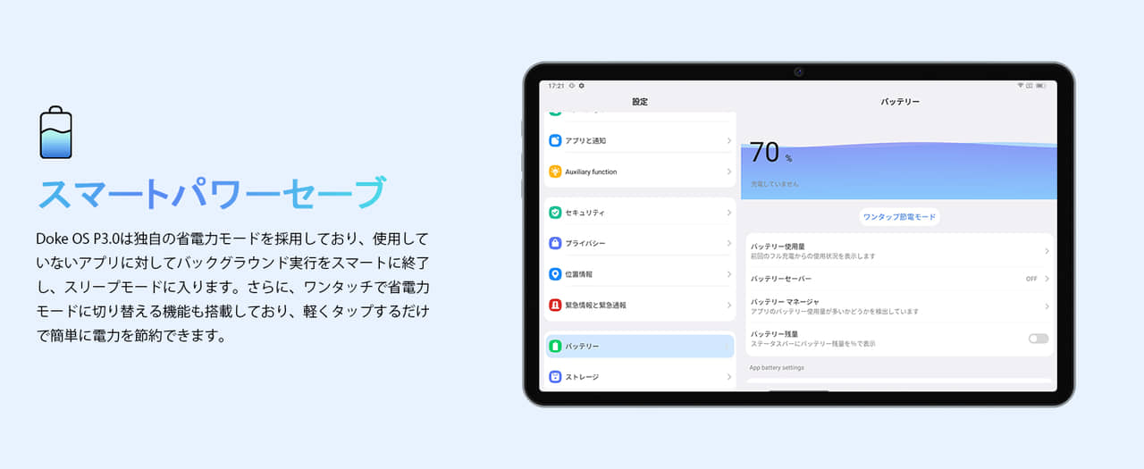 ▼あと標準AndroidからカスタマイズしたDoke OSってのを搭載しているのもBlackview製品の特徴。UIデザインがタブレット向けに最適化されているほか、省電力モードが結構厳格でバックグラウンドアプリを容赦なく潰し電池消費を抑えます。↓