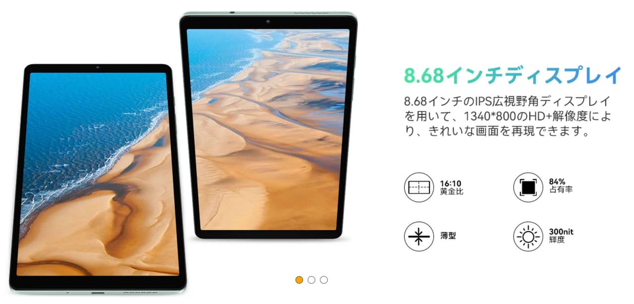 ▼ディスプレイは8.68インチ。HD+クラスの解像度なのでドットは粗は感じそうですが、視野角の広いIPS液晶となってるのがGood!↓
