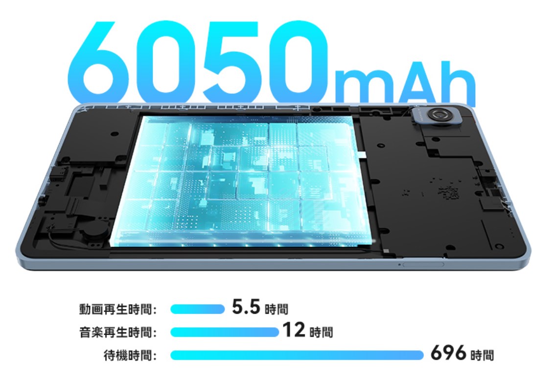 ▼バッテリー容量は6,050mAhと小ぶりなタブレットながらなかなかの大容量。動画再生は最長5.5時間なので長時間の視聴は厳しいですが、電子書籍とかWEBとか普段使いなら1日は持つかと期待したいところ。↓