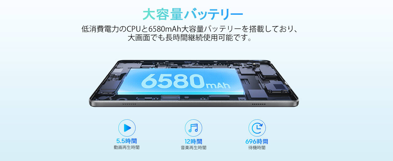 ▼バッテリー容量は6580mAh。動画再生時間は最長5.5時間とのことです。タブレットとしては並かその下レベルにはなりますが、このモデルはSIM非対応で基本的に家に置いとくやつって考えれば気にしなくていいかもしれん。↓