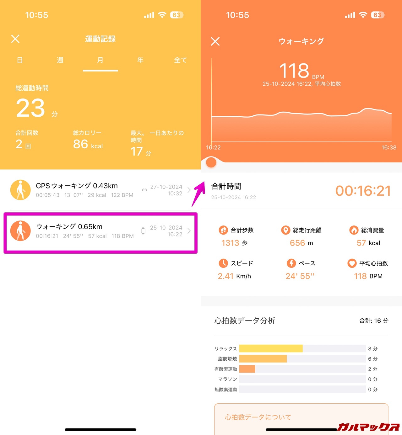 スポーツモードのデータはシンプルなので本格的に運動データを取得したい人は物足りないと思いますが、私のように常にスマホを持ち歩いているならGPSを使った運動データも取得できるので必要十分な感じでした。