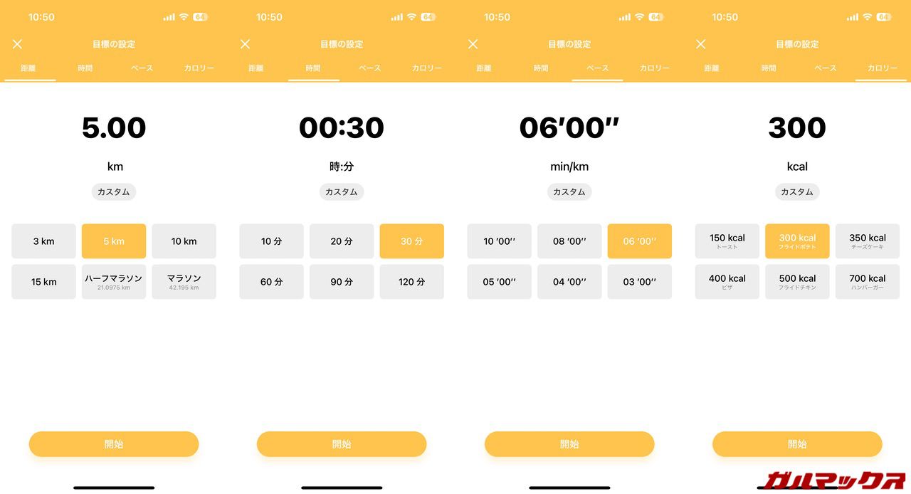 ▼またGPS系メニューではとりあえずスタートしてデータを取得する使い方もできますが、距離、時間、ペース、カロリーなどの目標を設定したトレーニングも可能です。↓