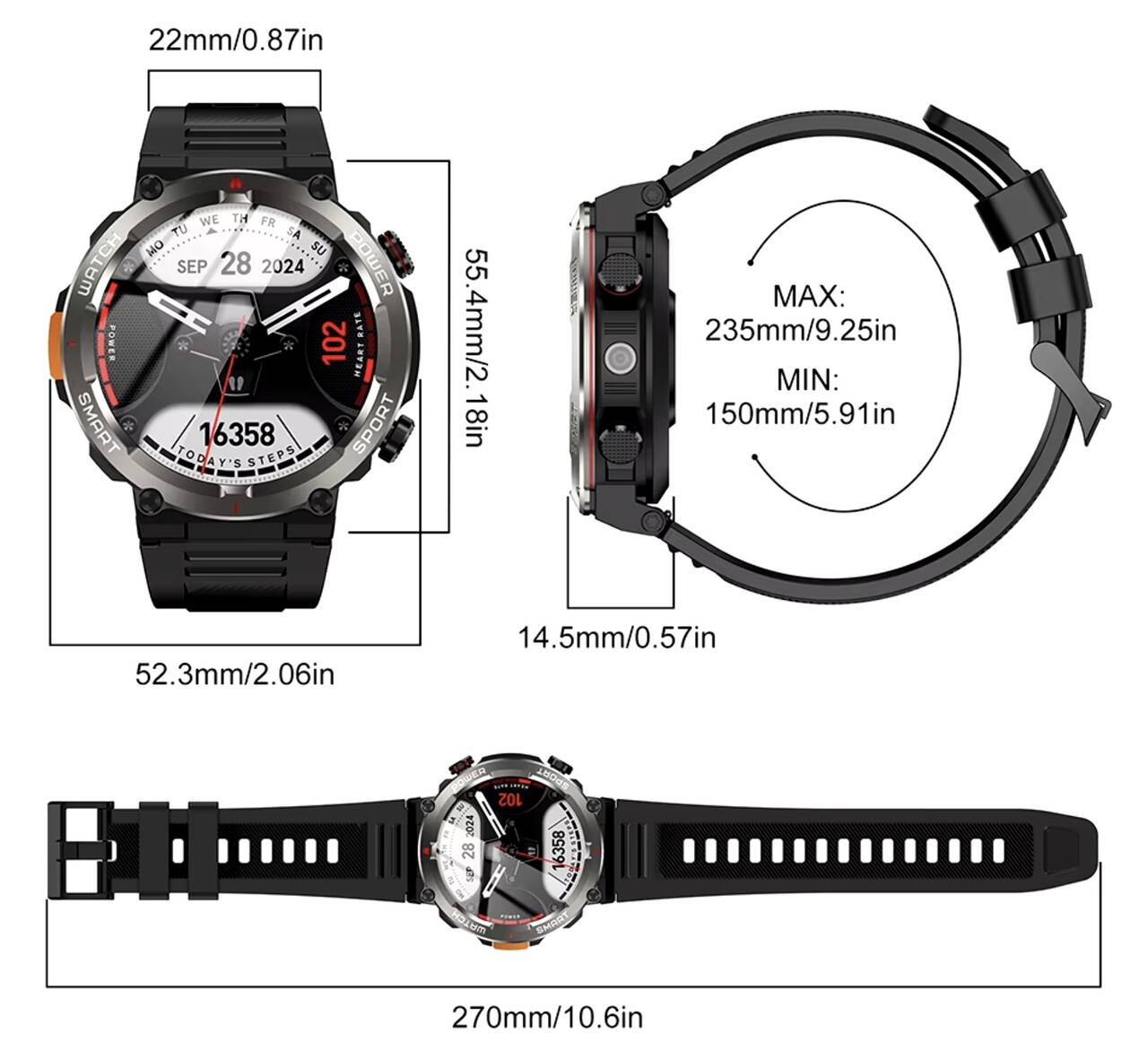 Blackview W50 Proは見た目からして分かる通りタフネス系のスマートウォッチ。見掛け倒しではなく耐衝撃仕様のモデルなのでホントに頑丈!寸法は上の通りです。