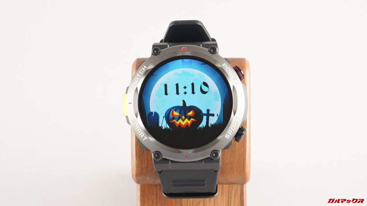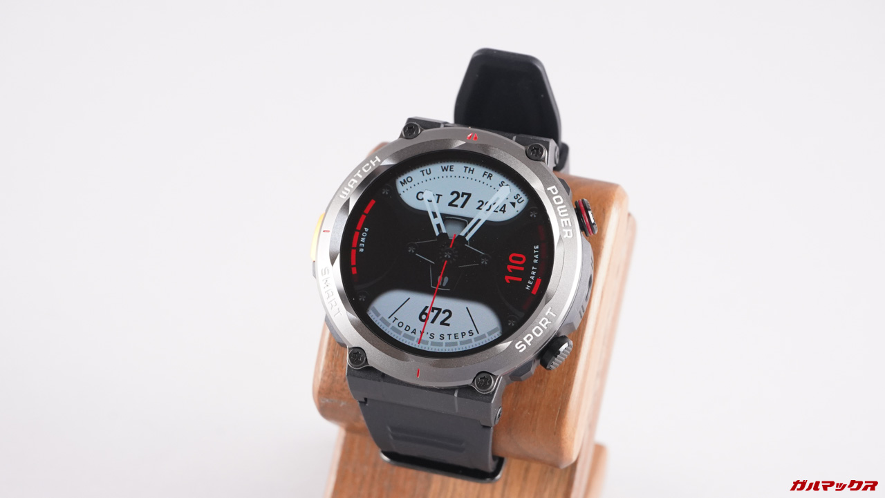 ▼ディスプレイは円形で1.45インチ、解像度は360×360と結構高め!ただし液晶タイプなので有機ELと異なりバックライトの白っぽさ、AoD非対応という点は注意です。↓