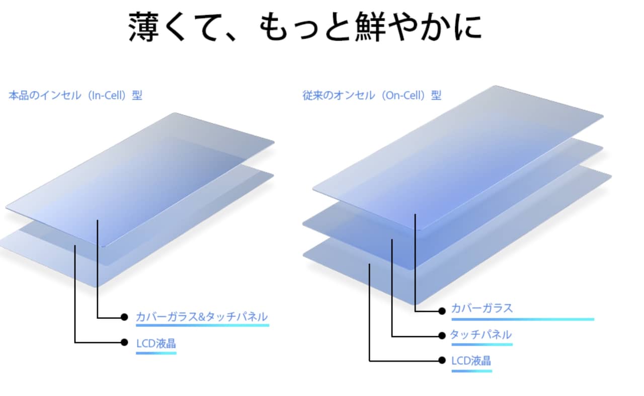 ディスプレイは結構こだわっていて、薄さと鮮やかさを両立するin-Cell型を採用しているのがポイント。