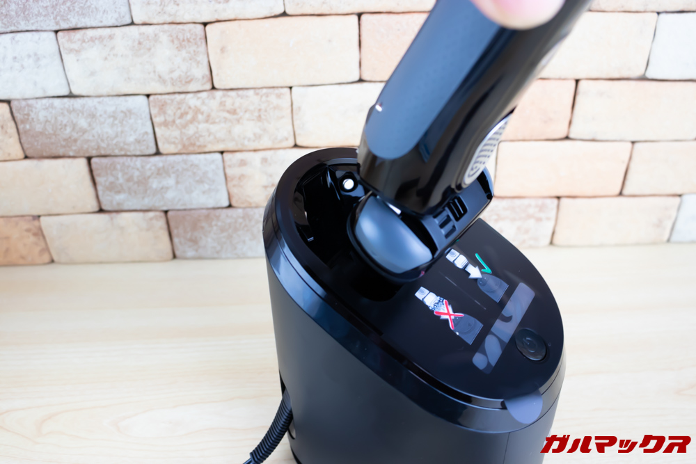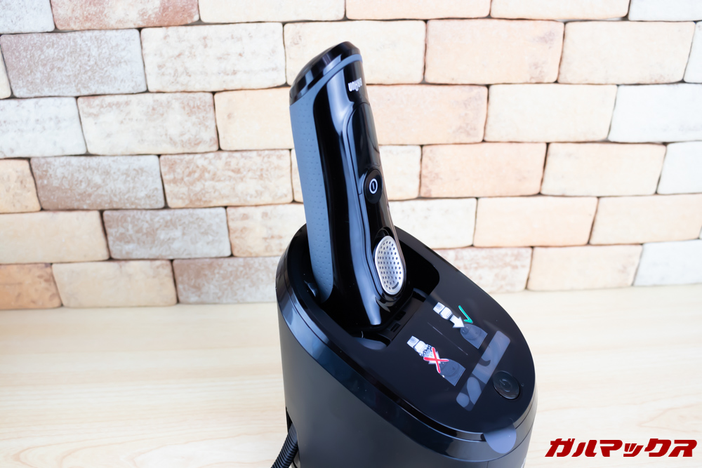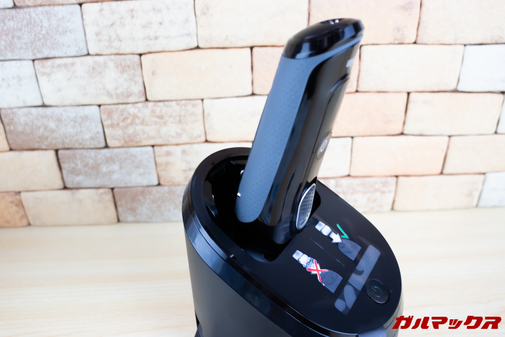 ▼BRAUN Series 9(9250cc-P)の本体は少し手前に角度をつけてヘッド先端を洗浄器に差し込み、奥側に倒すとセット完了。これで充電から洗浄まで全て行ってくれます。使い方が凄くシンプルで良いですね!↓