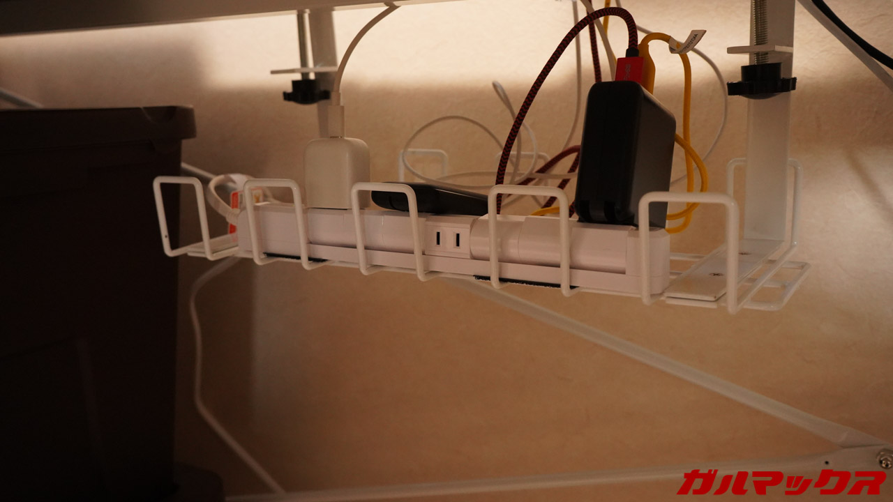 床に電源タップを転がすと充電ケーブルの長さが足りなくなりますが、ケーブルトレーに電源タップを置いちゃえばその問題もクリア。