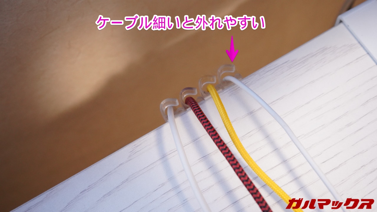 ▼で、デスクの側面に貼り付けてケーブルを通してみたんですが、細いケーブルだとクリップから外れてしまうことが分かりました。↓