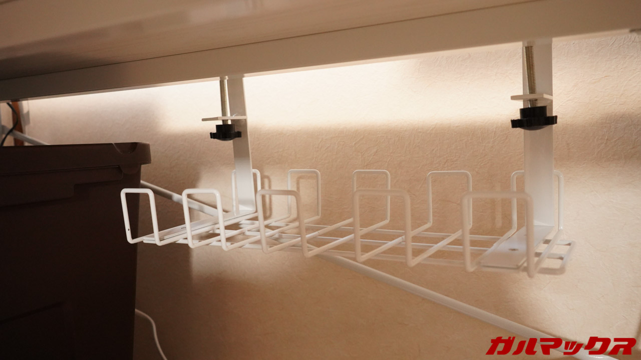 ▼ケーブルトレーはこんな感じ!ケーブルは頻繁に引っ張り出すので固定してません。まあゴチャゴチャしてますが、テーブル下を覗き込まないと見えないので全然OK。↓